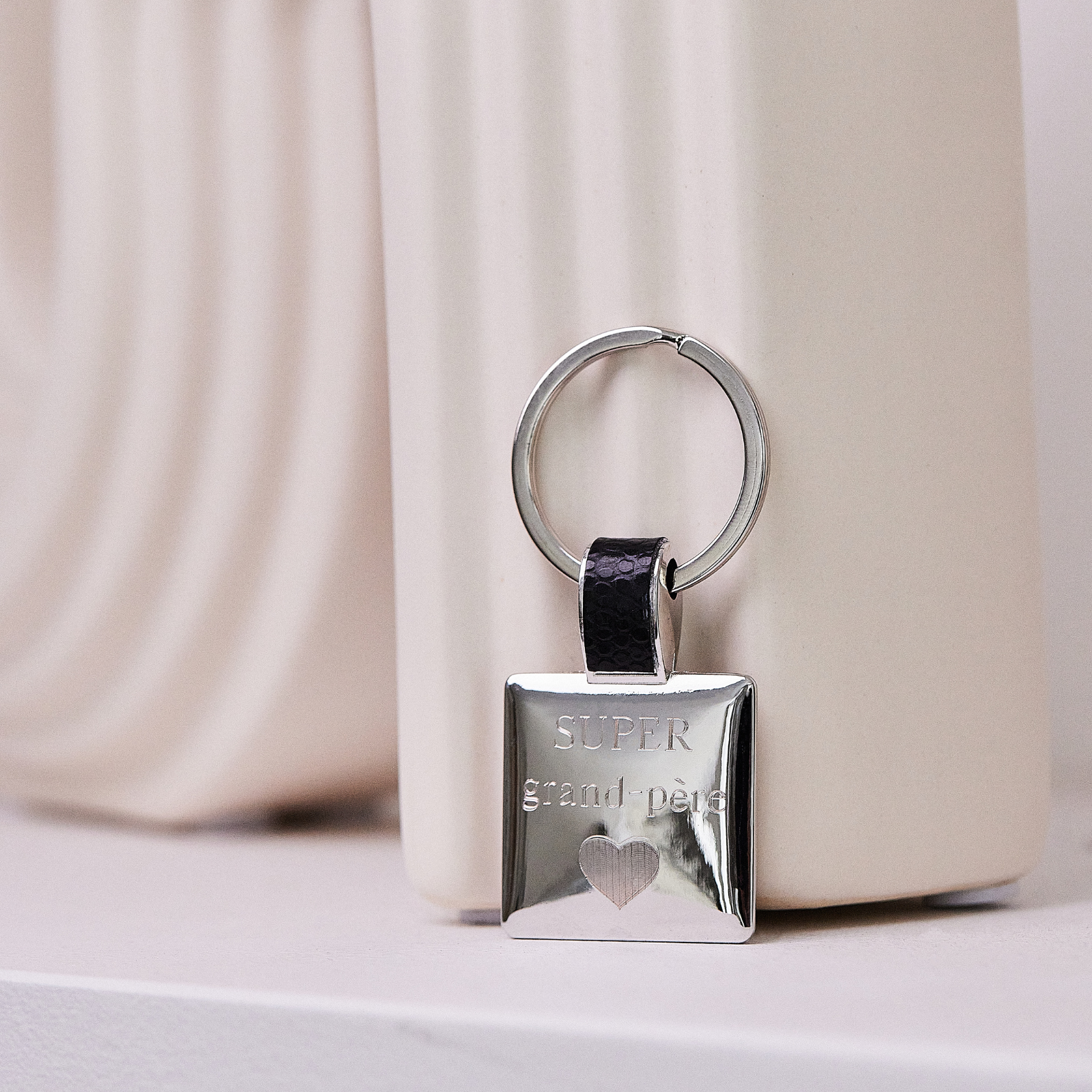 Porte-clés acier et cuir carré noir